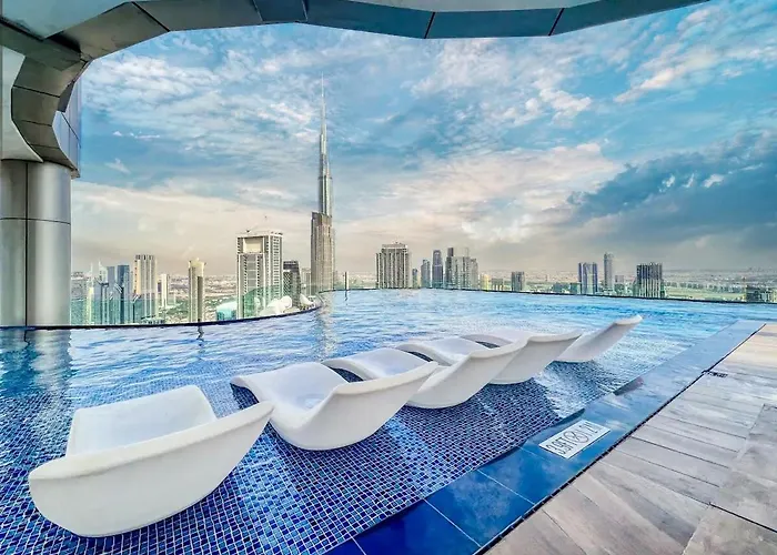 Die 124 m^2 große Ferienwohnung Tallest Infinity Pool With Burj Khalifa Views Dubai liegt im Bezirk Business Bay von Dubai und bietet Luxus wie einen Whirlpool. Die U-Bahn-Station Business Bay ist in 1 Kilometer Entfernung vom Apartment, und Burj Khalifa-View from Top ist auch in einer Entfernung von 5 Gehminuten von der Unterkunft.